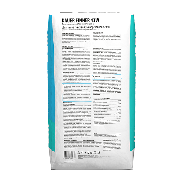 Шпатлевки: Dauer Finner® 43 W Шпатлевка гипсовая выравнивающая белая, упаковка 20 кг